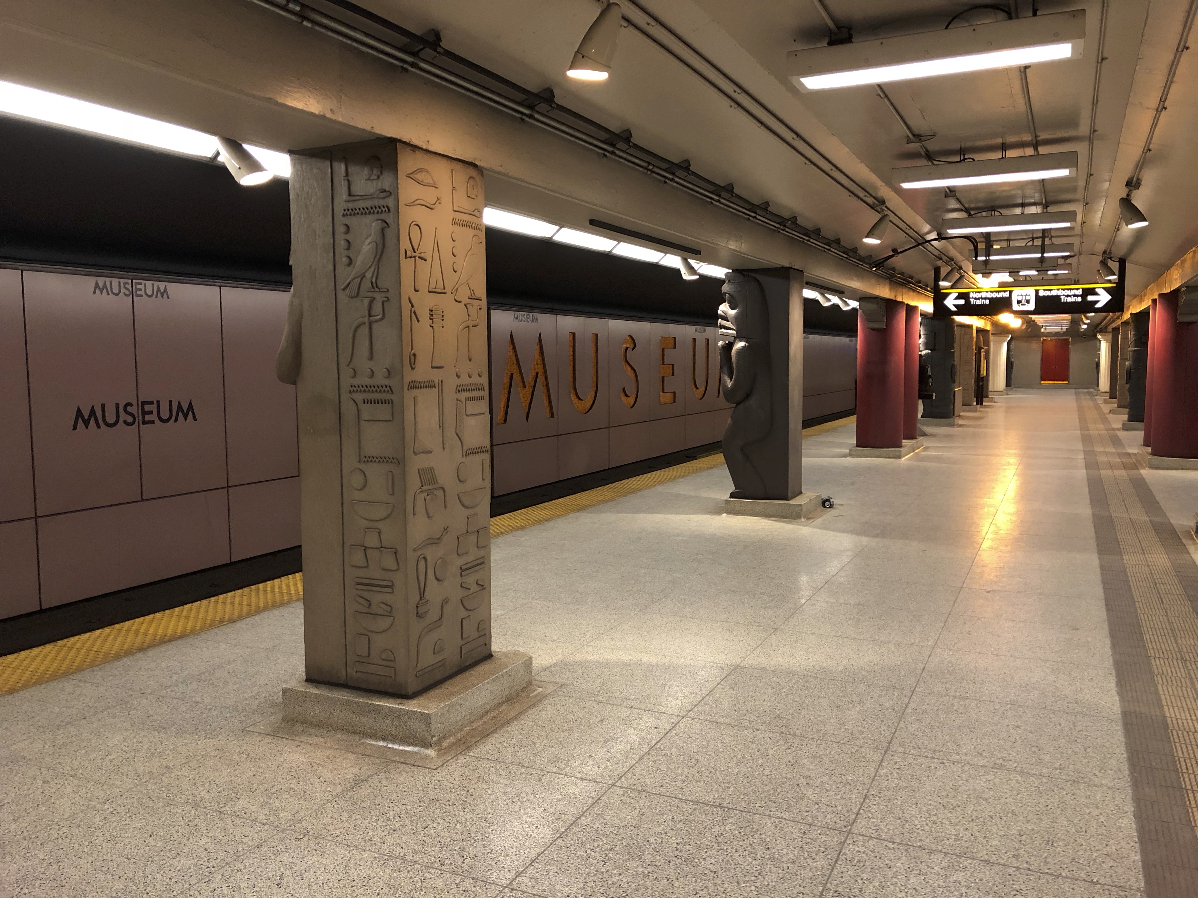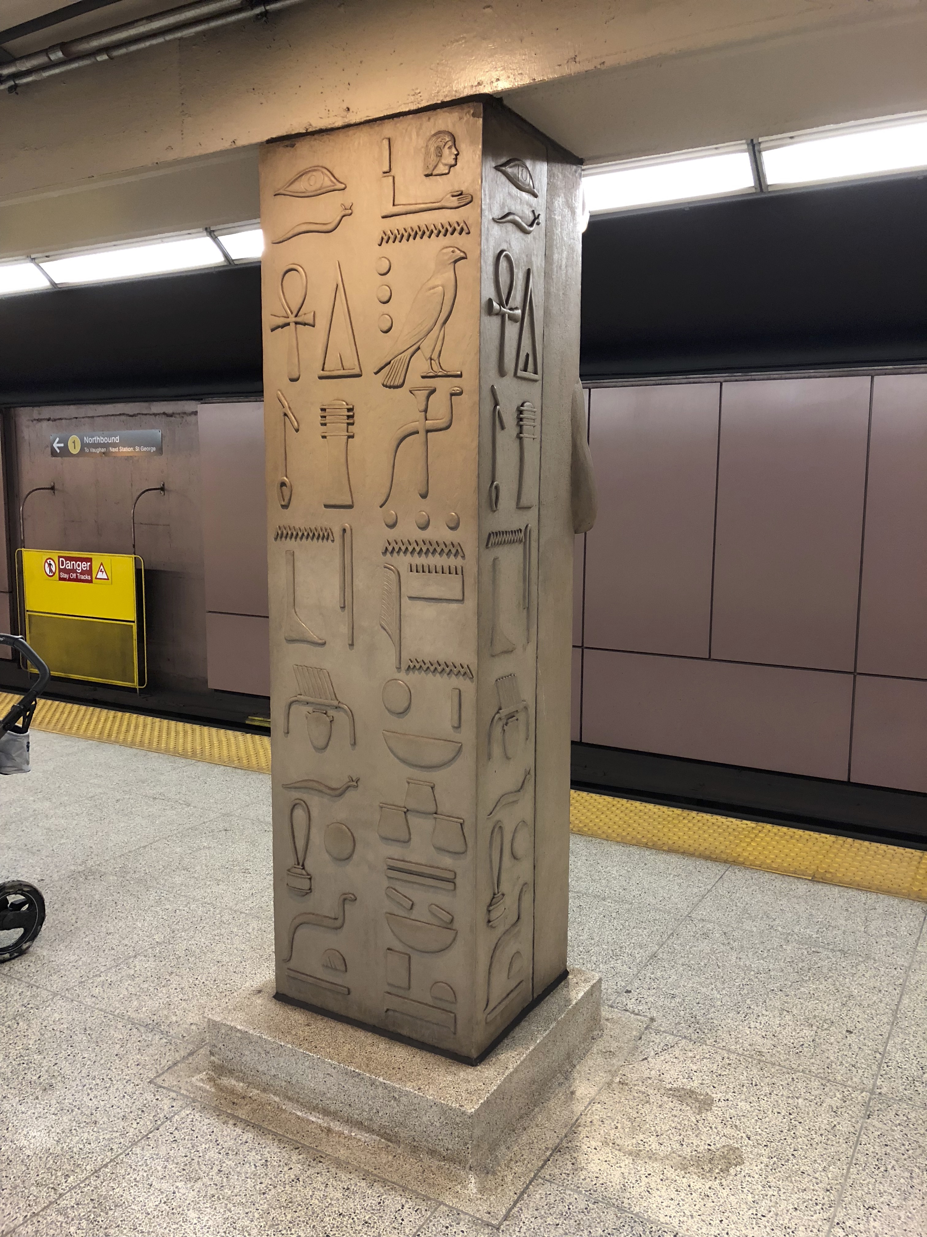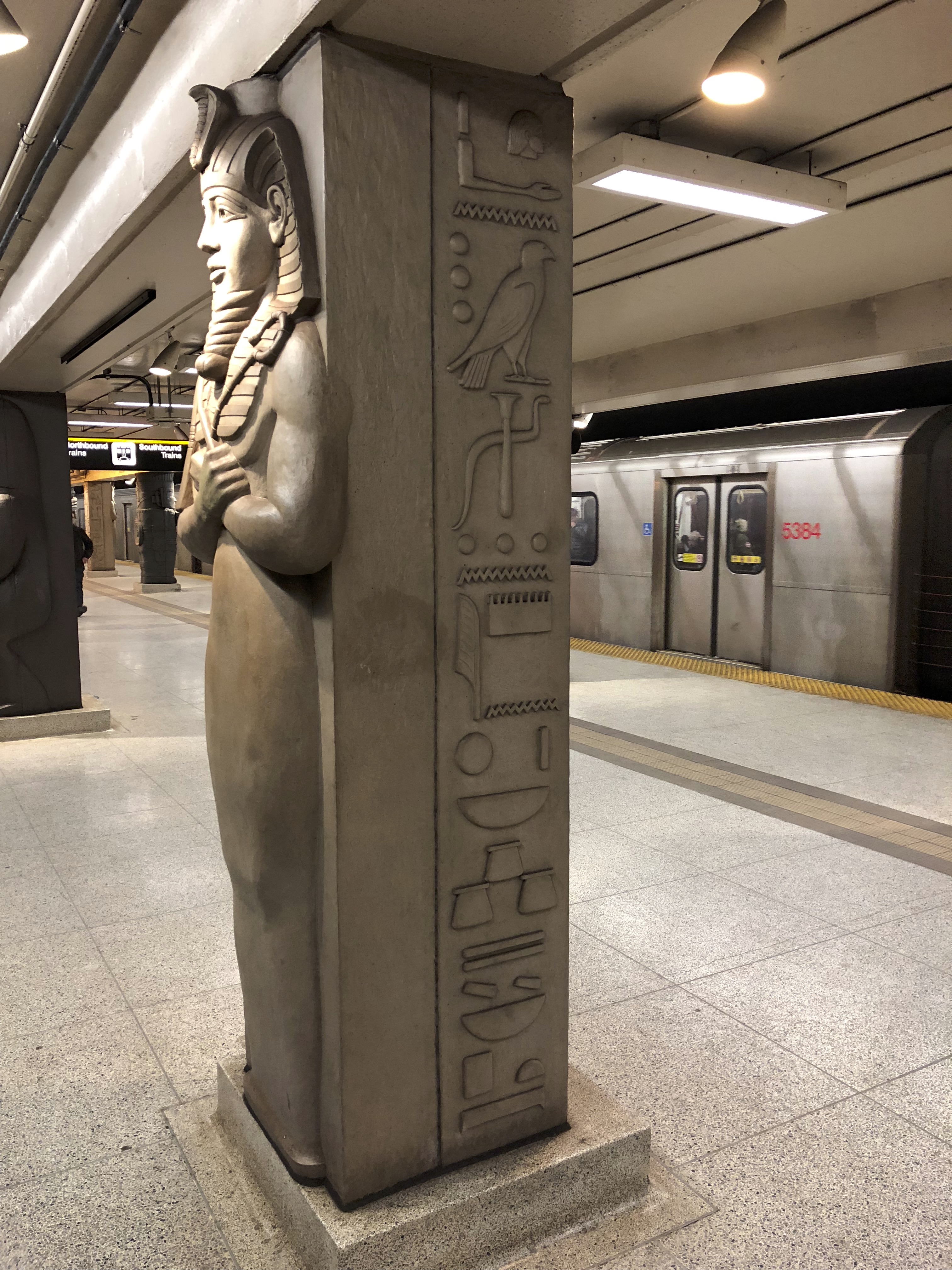Museum Station, located on the eastern part of Toronto’s Bloor Street Cultural Corridor, conceals Egyptianising treasures from the eyes of passers-by on the street above. Its design for most of its life was like any other Toronto subway station – bland colours and a band running along the top with the name of the station. As the name indicates, the station was built to allow transit-takers to visit either the Gardiner Museum of Ceramics or the Royal Ontario Museum (ROM). Today, visitors using the station can marvel at columns decorated in the traditions of Canada’s First Nations as well as those of Ancient China, Egypt, Greece, and Mexico.