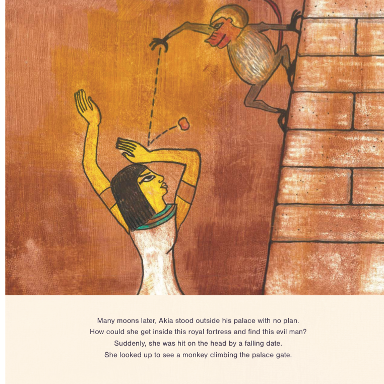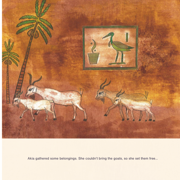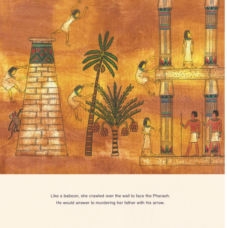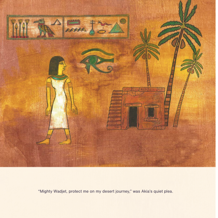 NS: Author George Neeb supplied us with a copy of his new book, Pharaoh’s Arrow, for review on the blog, and we’re glad he did! Using charming rhymes, the book tells the story of a young girl named Akia who embarks on a mission to the palace after misfortune befalls her father. Neeb’s bright illustrations in Egyptian 2-dimensional style and hieroglyphic vocabulary interspersed throughout are the greatest parts of this book. At the back, Neeb describes how he achieved his papyrus texture through paints so that readers can replicate his art style for their own story.