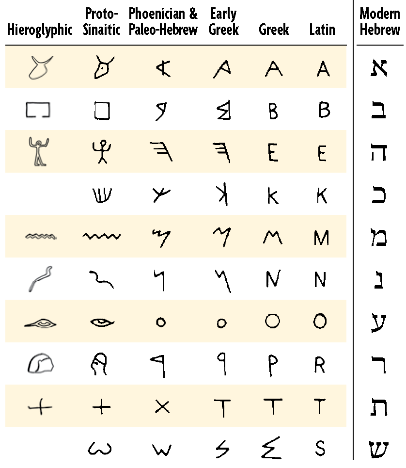 - The table of the scripts has been adapted from page 45 in O. Goldwasser. 2010. ‘How the Alphabet Was Born from Hieroglyphs’. Biblical Archaeological Review 36 (2): 40–53.