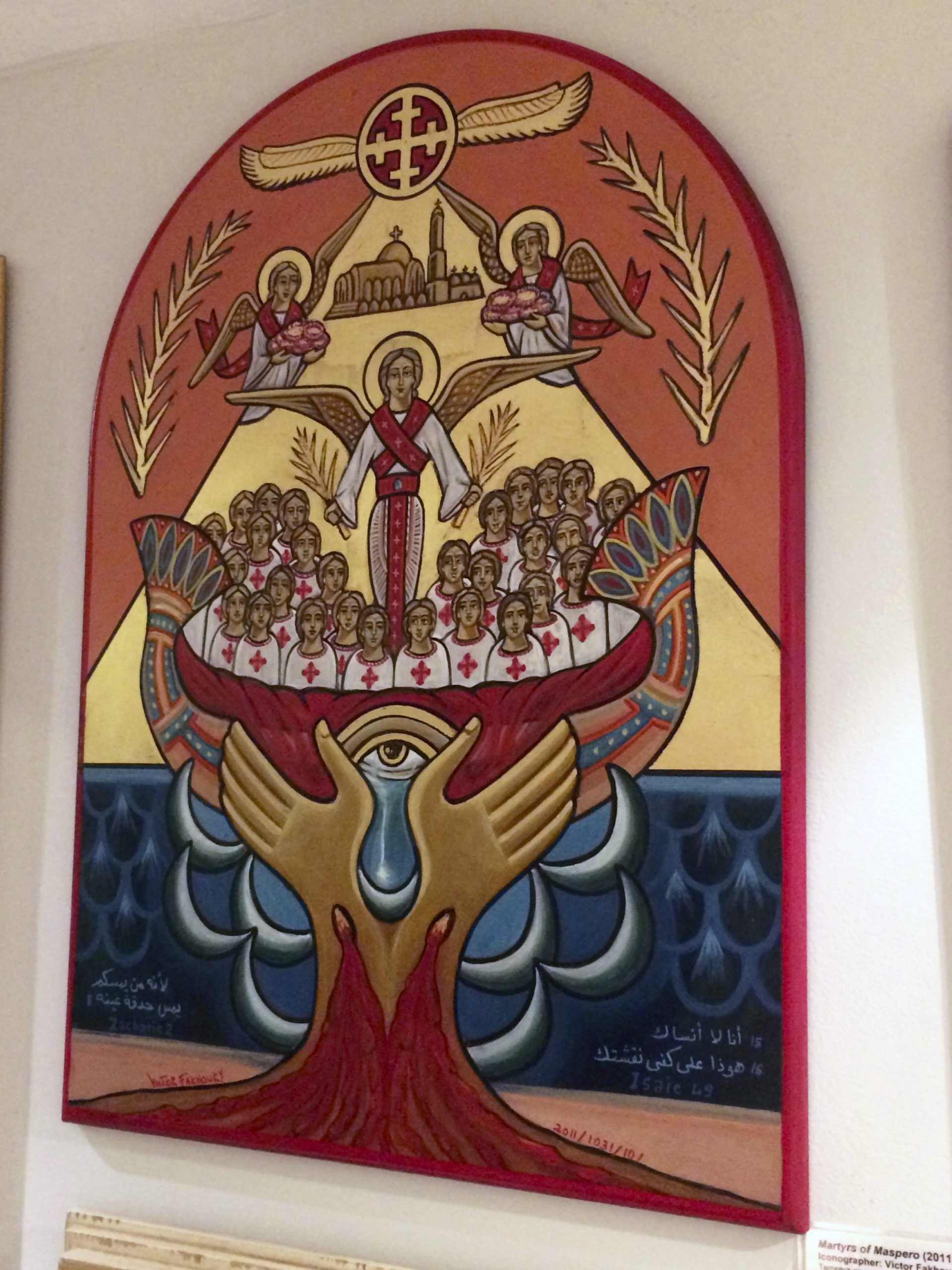 With the boat nestled in the hands of God, the viewer’s eyes are directed upwards to the top of the icon. Here, a depiction of Cairo’s famous St. Mark’s Coptic Orthodox Cathedral rests in between two angels and on top of the cathedral is the cross motif with outspread eagle wings – this brings to mind immediately the sun-disk and outspread wings common on ancient Egyptian scenes. All in all, the icon brings ideas of reflection, regeneration, and rebirth to the forefront and is a testament to Fakhoury’s skill in binding together ancient Egyptian and Coptic, whether traditional or more recent, motifs in light of recent events.