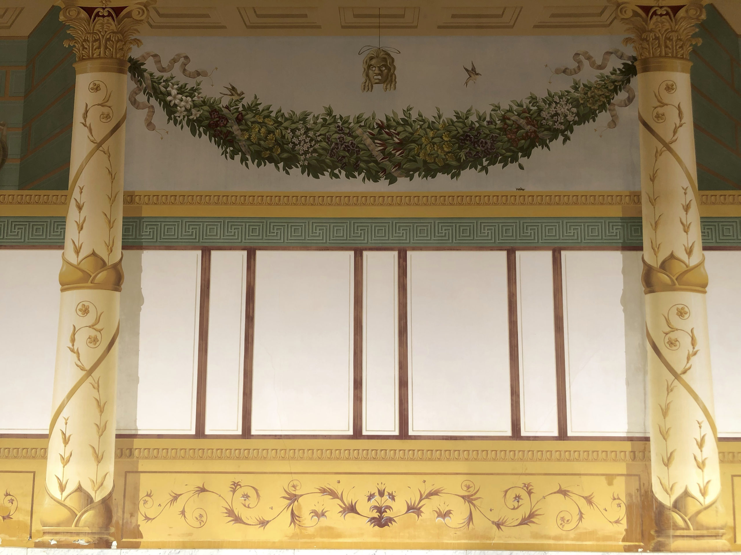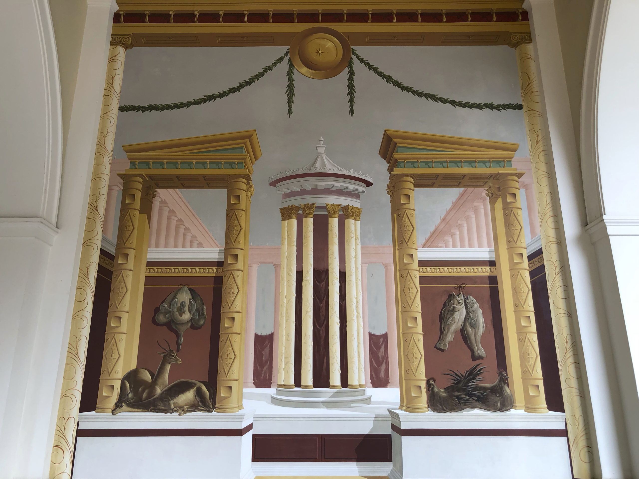 Close by, also on the north of the Inner Peristyle, is the Basilica. The First Century CE Roman historian Vitruvius is the first to use the term “basilica” to describe a large public meeting hall that was also sometimes incorporated into private homes for use as a meeting hall or private shrine. Plans of the Villa dei Papiri show a similar room with a vaulted apse at one end and a columned anteroom at the other, possibly along the lines of the reconstruction of the Basilica in the Getty Villa. Here, the Basilica acts as another chapel, this time for Venus, with alcoves dedicated to the Muses along the side walls.