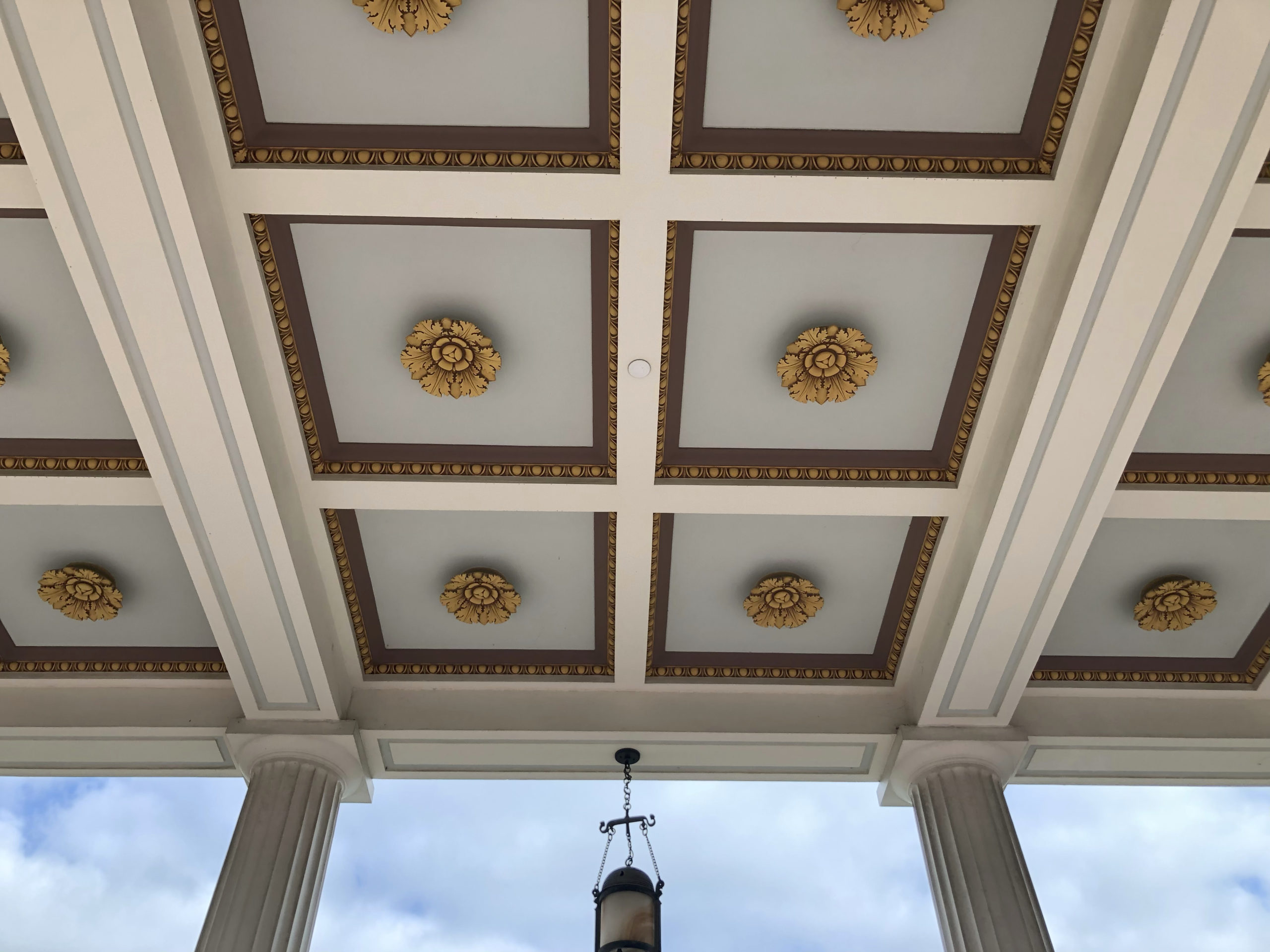 On the north side of the Inner Peristyle is the Temple of Hercules. The floor is a meticulous recreation of one found at the Villa dei Papiri. The stone used in this reconstruction, imported from North Africa, Turkey, the Poloponnsos, and Greece, gives you a real understanding of the wealth needed to build such a home in ancient times and the effort it required to transport the stone from distant lands, not to mention the artisans employed in creating such works of art. The intricate, spiralling design of coloured stone tiles gives a feeling of weightlessness and otherworldliness as one stands before the statue of the god worshiped within. Though a chapel, like this one, would never have existed in a private villa like the Villa dei Papiri, it was incorporated here to display the statue of the Lansdowne Hercules, discovered at the Roman Emperor Hadrian’s villa near Tivoli, Italy. The Temple of Hercules acts as focal point for the architectural flow of the Inner Peristyle. J. Paul Getty considered the statue of Hercules the most important in his collection and it is clear he placed it at the centre of his collection.