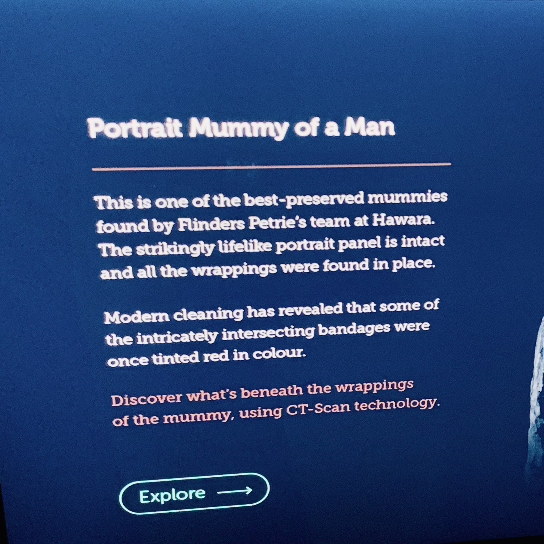 Near several displays were interactive display panels which allowed the visitor to examine a mummy digitally. They could see the intricate craftsmanship of the painted, outer layers or examine the body by means of CT-Scans. For example, one could look at the surviving folds of skin around the waist of an individual and learn these folds to be an indicator of being overweight. Nevertheless, adopting technologies to study the ancient past has been quite prevalent in our field (rightly so!) (1) and I did find the interaction here to be straightforward and user-friendly.